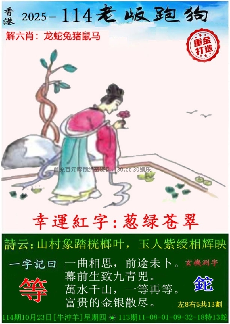 玄机詩雲:山村象踏桄榔叶,玉人紫绶相辉映。一曲相思,前途未卜。幕前生致九青兕。萬水千山,一等再等。富贵的金银散尽。